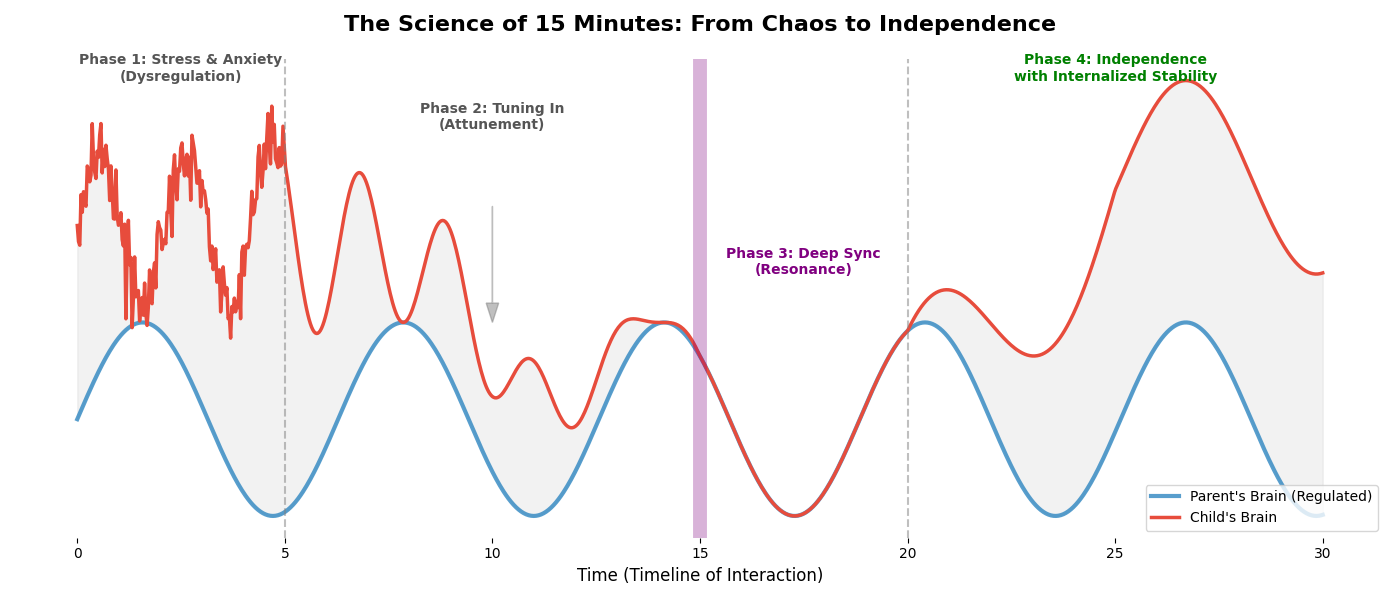 부모의 안정된 뇌파(파란선)와 아이의 뇌파(빨간선)가 15분간의 상호작용을 통해 동기화되는 과정